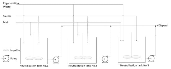 The conventional regeneration step produces large quantities of neutralization waste volume which requires large quantity of chemical to adjust the pH and also larger volumes of reactors for the process. The large volume of waste stream takes longer neutralization time. Furthermore, inefficient mixing in large volumes cause fluctuations in pH adjustments. In the specific industrial project that the authors were involved in, expansion of existing IX process was nearly impossible due to space limitations for the conventional neutralization process in the current facility [7]. Therefore, there was a need to optimize the neutralization methodology so that larger volumes can be handled without significant requirements of space, increases in costs, and volume of waste streams. There is a great need for debottlenecking methods and optimization of existing neutralization setups in the industry that have not been addressed as yet [8,9,10,11].