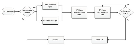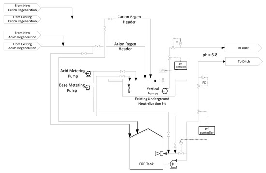 Parameters such as inefficient mixing, long neutralization time, excessive volume of IX regeneration streams, and their environmental impact [12,13,14,15] are the main drivers of this research. By reducing the neutralization volume, other associated problems, such as inefficient mixing and long neutralization time, also gets addressed effectively. This work presents an analysis of various IX regeneration waste streams to come up with an efficient and cost-effective way of selecting and treating the selected waste streams to achieve an improved neutralization process. Additionally, a more environmentally friendly setup is proposed by reducing the quantity of acid and base required and changing the neutralization setup from below ground to above ground. The selected streams also enable quicker and easier neutralization thereby reducing the time required for neutralizing the waste streams.