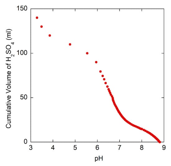 The concentrated stream from IX regeneration was further titrated with 0.02 N H2SO4. It was seen that the pH change was pretty sharp between 6–8 pH suggesting the need for effective agitation (see Figure 4 and Figure 5).