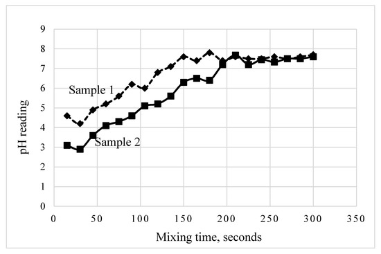 Based on the efficiency of the eductors and turnover rate achieved in the neutralization tank it was seen in experiments that the desired pH can be achieved within 200 s. Figure 6 shows the plot of two samples collected from the concentrated streams and neutralized to reach a steady pH of 7.