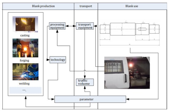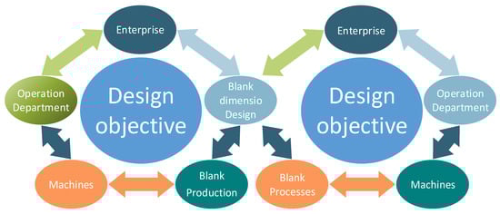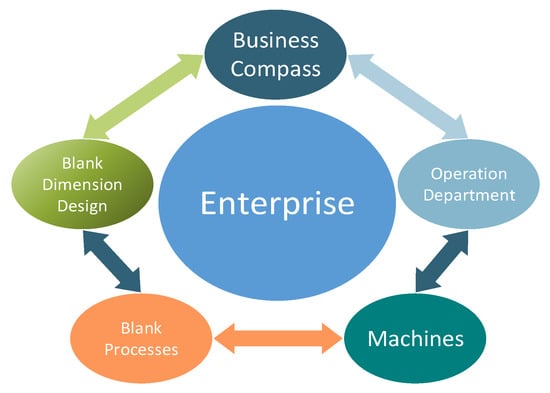 A blank is a semi-finished product designed to be processed into a work piece. The dimensions of the blank appear in the production process and disappear after it is used. The dimensions of the blank are an important link between the production process and the use process. The dimensions of the blank determines the operation process of the blank production and use enterprise, including processing technology, the selection of processing equipment, the establishment of processing procedures, and the optimization of processing parameters. Blank-dimension design is a complex system, not only for the blank production and use process’s equipment, participation, and determination of production goals, but also for the enterprise’s overall planning, department planning, operator technology, and many other factors; the relationship is shown in Figure 1. It involves coordinating with related departments, arranging personnel and equipment according to production quantities, and the general target of the enterprise. Blank-dimension optimization based on enterprise is a complex system engineering pursuit that needs to strengthen the top-level design and overall planning of enterprise, and strengthen the connection of relevance, systematism, and feasibility studies. Based on the determination of the blank-dimension design’s objective, the relationship between each factor and the coupling relationship between each factor are studied in order to promote each other in the implementation process and obtain the best actual effect.