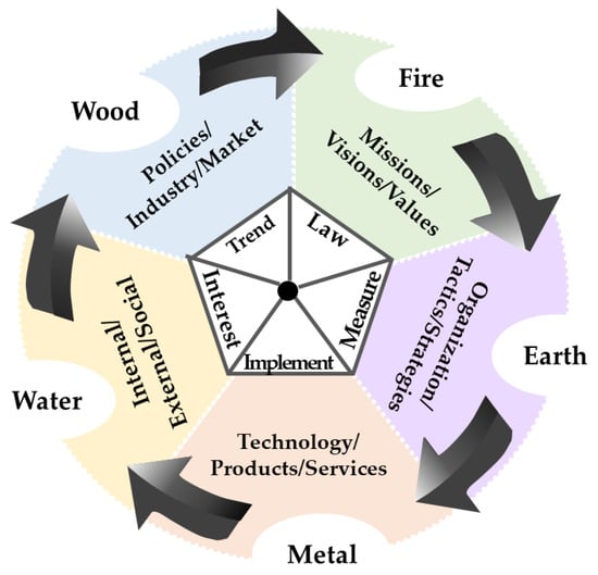 A business compass is a people-oriented business thinking system based on all-new perspectives. It serves as a corporate tool of top-level design. The five dimensions of the business compass, which connote the five elements in ancient Chinese philosophy, are at the core of management theory and practice; Figure 2 shows the relationship. These elements, wood, fire, earth, metal and water, comprise a systemic worldview typical of Taoist philosophy. Joseph Needham believed that Taoist philosophy developed many of the most important features of the scientific attitude [33]. Chen explained that “Tao” is the cause of all things, but is itself not subject to any cause [34]. Regarded as fundamental elements of all things in the world, the five elements theory looks at the world’s temporal–spatial structure with insights, and depicts how things are generated and come into being as a relationship of coexistence and inter-restriction as well, which is shown in Table 1 and Table 2. The five dimensions; namely, trend, law, measure, implement, and interest, are symbolic of corporate management in that they constitute the five elements of a business activity and define the genesis and operation of an enterprise in the temporal and spatial dimensions. The five dimensions can be adopted to depict the specific problem and provide solutions for it in corporate management. When identified, the relationship of coexistence, coordination and inter-restraining can be used to cope with more systematic problems when it comes to competition and cooperation [35]. Business compass and blank-dimension design in enterprise operation is shown in Figure 3.