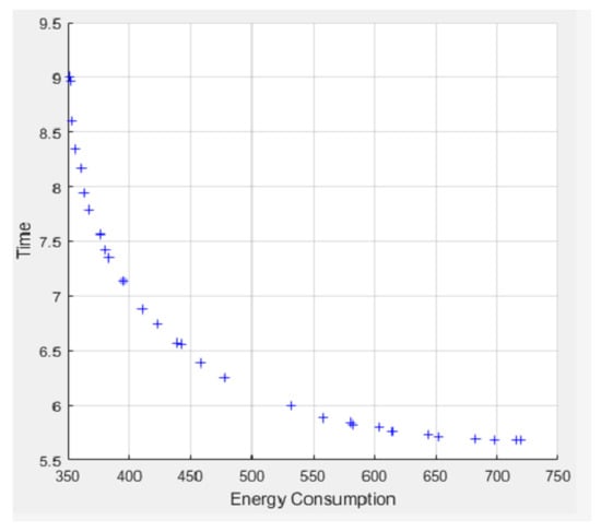 The energy-consumption and time-objective diagram simulated by the NSGA-II algorithm was similar to an exponential function and shown in Figure 8. The designed blank dimension could be calculated by the workpiece dimension and back-cutting amount. The optimal energy consumption and time were 458.6 and 6.3, respectively. The designed optimal blank dimension was 53.62.
