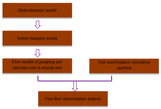 There are dozens of injection wells in each mining area in the actual production of ISL uranium. Due to the limitations of tracer types and industrial production process conditions, it is tough to inject different tracers into each injection well for a long time. Therefore, we can only build the unit flow model of ISL uranium mining area, add different tracers into the injection well of the model, and then calculate and analyze the unit flow microbalance according to the simulation results. The specific process is shown in Figure 2.