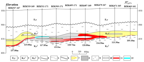 Statographic view of the Saihan Formation. (Note: 1—irdingmanha group; 2—upper part of Saihan group; 3—lower section of Saihan group; 4—lithological boundary; 5—parallel unconformity; 6—angle unconformity; 7—oxidation zone; 8—gray sandstone; 9—regional aquifers; 10—local aquifers; 11—uranium ore body; 12—uranium mineralized body).