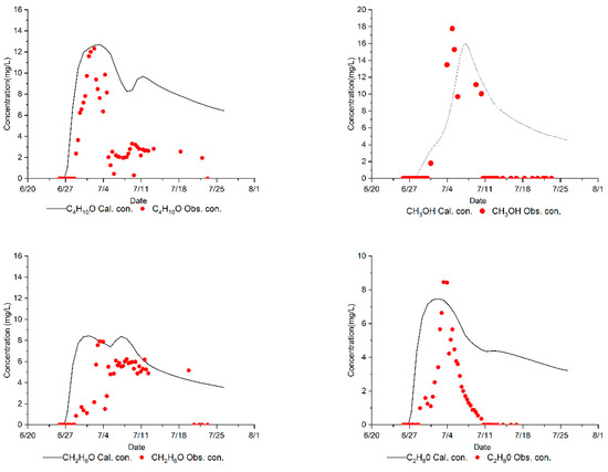 Time dependence curves of observed and calculated concentrations of four alcohol tracers in leaching solution of central monitoring well.