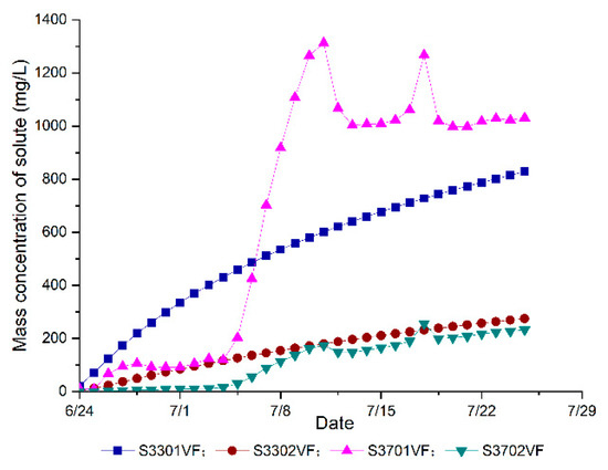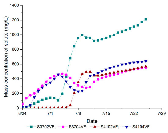 According to the model calculation results (Figure 15), the mass concentrations of the solutes S3702, S3704, S4102, and S4104 in the extraction well 3902 at the end of the simulation on the 32nd day were 1209.38, 553.00, 568.11, and 642.17 mg/L, respectively. The four solute concentrations were relatively high. Solutes S3702 and S4102, and solutes S3704 and S4104, respectively, had similar concentration trends. According to the orifice flow number of this unit, the concentration of solutes S3702 and S4102 in the leaching solution of the pumping well 3902 and the flow rate of the corresponding orifice had similar changes. Therefore, the two solute concentrations of S3702 and S4102 in this unit were controlled by the corresponding injection well. At the same time, notice that in the second half of the simulation, the flow rates of the four injection wells tended to be similar in the concentrations of S3704, S4102, and S4104, and only the concentration of solute S3702 was twice the concentration of the other three solutes.