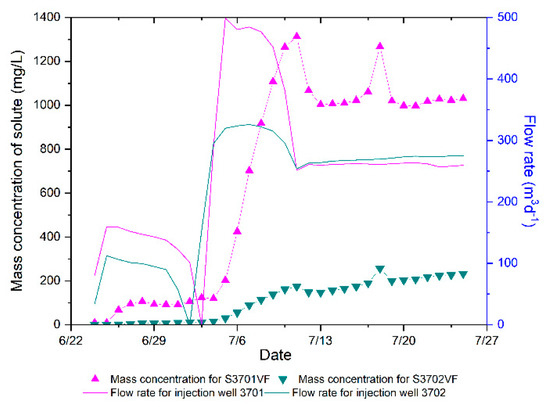According to the calculation results of the model (Figure 11), the mass concentrations of solute S3301 and solute S3701 in the extraction liquid 3501 on day 32 reached 828.42 and 1031.29 mg/L, respectively, while the mass concentrations of solute S3302 and solute S3702 were only 275.06 and 232.89 mg/L, respectively. It can be seen from Figure 11 that the concentration of solute S3301 in the leaching solution of the 3501 pumping well shows a climbing trend. The concentration of solute S3701 in the pumping well of the unit increased in a stepwise manner. After 11 days of solute injection, the concentration of S3701 in the extract of the pumping well 3501 increased rapidly, from 119.42 to 1312.81 mg/L within 7 days, and then dropped again to about 1000 mg/L. Carefully observe the changes in the concentration of the solute S3702, which has a similar trend to that of the solute S3701. The comparison of the flow rates of injection wells 3701 and 3702 and their solute concentration changes showed the same but lagging fluctuations (Figure 12). This showed that the concentration of the solutes S3701 and S3702 in this unit was mainly controlled by the flow changes of the injection wells 3701 and 3702, but the hydraulic connection between the injection wells 3501–3701 was smoother.