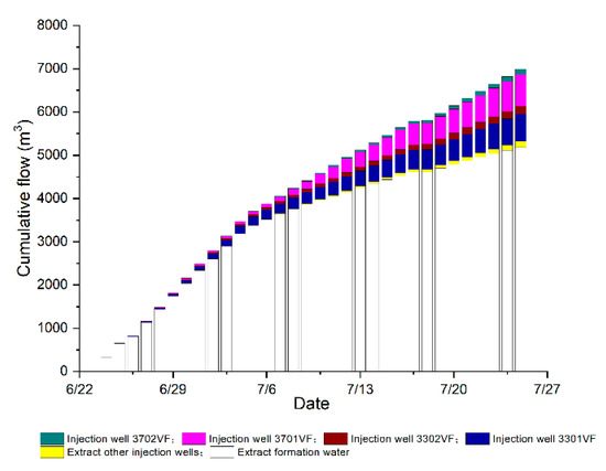 Taking injection well 3308 as an example, we show in Figure 6 that the flow rate changes with time before and after adjustment. Except for the marginal injection well that needs to adjust the flow rate, the flow rate of the remaining boreholes in the target mining area is taken from the mine’s actual daily production flow data.