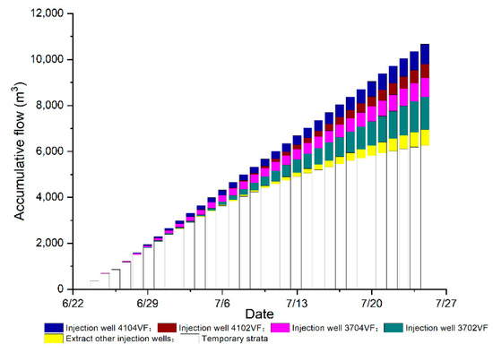 On the basis of the solute and its concentration changes in the leaching solution from the extraction well 3501, we analyzed the flow composition of the solution from the extraction well (Figure 13). It can be seen from the flow analysis diagram that within 32 days after the end of the simulation, a total of 6988 m3 of the solution was extracted from the 3501 pumping well, including 5127 m3 of formation water, accounting for 73% and 193 m3 of other injection wells, accounting for 3%. These data show that the pumping well 3501 only had a hydraulic connection with the four pumping wells in the unit.