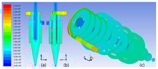 - Generally, the distribution of static pressure was axisymmetric, and its value decreased with the increase in the axial depth. The maximum was located near the tangential inflection point of the feed inlet, while the minimum appeared in each outlet. However, due to the left tangential inlet and the right screen underflow outlet, local asymmetry can be observed.