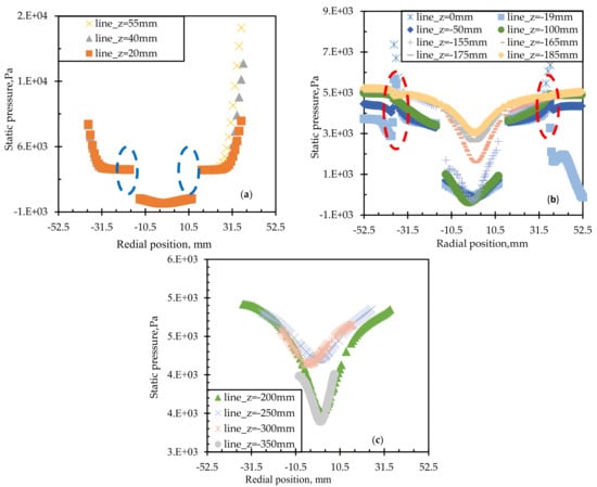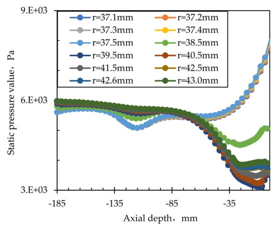 - In the same horizontal plane, the static pressure decreased gradually along the wall to the center. Near the cylindrical screen, as the axial depth increased, the static pressure inside the cylindrical screen gradually decreased, while that outside the cylindrical screen regularly increased. As the axial depth increased to about −85 mm, the static pressure of the two sides was closely in equilibrium. Then, the pressure on the outside of the screen became higher than that on the inside of the screen.