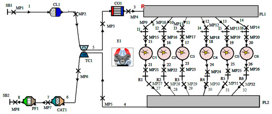 Simulation model of an entire diesel engine: SB—system boundary; MP—measuring point; CL—air cleaner; TC—turbocharger; CO—cooler; PL—plenum; I—injector; C—cylinder; R—restriction; E—engine; CAT—catalytic oxidizer; PF—diesel particulate filter.