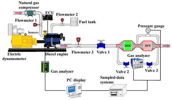 The experiment was carried out on a six-cylinder turbocharged intercooled four-stroke diesel engine refitted into a diesel engine. The specific parameters of the engine are shown in Table 1, and the layout of the engine is shown in Figure 3. Among them, the intake system is installed on the intake manifold, and the natural gas enters the cylinder together with the air to form a homogeneous mixture, which can accurately control the injection quantity of NG. The common rail injection system was powered by a high-pressure fuel pump. The improved diesel engine was directly connected with the hydraulic dynamometer. NOx, CO, and HC emissions were measured by Horiba exhaust gas analyzer, the AVL DEWE-2010CA diesel engine combustion monitoring system was adopted, and the electronic unit pump control system was used to accurately control the fuel injection quantity of the engine. In the experiment, the injection pressure of the injector remains constant at 150 MPa. In addition, the diesel and natural gas properties parameters were shown in Table 2.