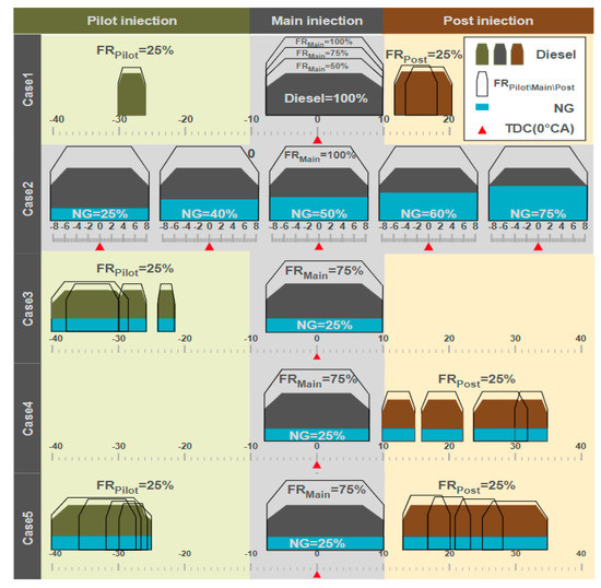 Numerical simulation technology can be used to analyze the combustion process in the cylinder and provide information of intermediate products and related free radicals. In the paper, the process of numerical simulation, which starts from IVC (564 °CA) to EVO (848 °CA) is studied. In the initial stage of the simulation, it was assumed that NG and air were uniformly mixed, and the pressure and temperature of the mixture were also homogeneous. During the experimental process, the engine speed was at the constant speed of 1800 rpm. Then, the cycle simulation under different injection strategies was shown in Figure 4. Among them, Case 1 calculated the results of four injection strategies of pure diesel, while Case 2 calculated the results of single main injection when burning dual fuel with different NG mixing ratios, which were used as the basis of comparative analysis. According to Equation (33), the energy fraction of natural gas is calculated by the low calorific value and mass flow rate of fuel. Similarly, according to Equation (34), the proportion of the mass flow rate of pre injection, main injection, or post injection to the total mass of diesel is calculated.