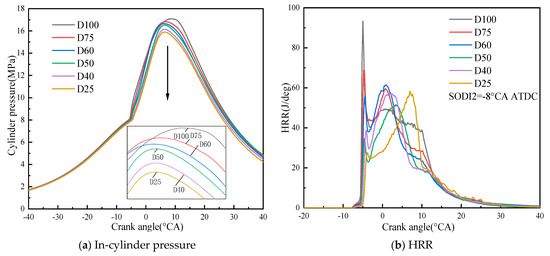 Figure 6a–c shows the cylinder pressure and HRR of the pure diesel case and the dual-fuel case with different NG mixing ratios. It can be seen that pure diesel (D100) has the highest peak cylinder pressure, followed by D75, D60, D50, D40, and D25. Based on the analysis of the HRR, the diesel injection time in the pure diesel case is earlier than that in the dual-fuel case. In Figure 6a, the cylinder pressure will be higher in the condition of the ahead-of-time heat release and the combustion phase, and more sufficient combustion in the compression stroke. In addition, as the proportion of NG mixing increases, the cylinder peak pressure generally shows a decreasing trend. It is due to the fact that NG and air are introduced into the cylinder in the form of a homogeneous mixture. As the proportion of NG increases, the excess air coefficient and the intake air volume decrease. Moreover, as the mixing ratio of NG increases, the amount of diesel injected into the cylinder will also decrease, and the spread speed of the flame will be slowed down, resulting in a low initial HRR. The pressure and temperature decrease accordingly in the initial combustion stage. Similarly, other studies had the same results [46,47].
