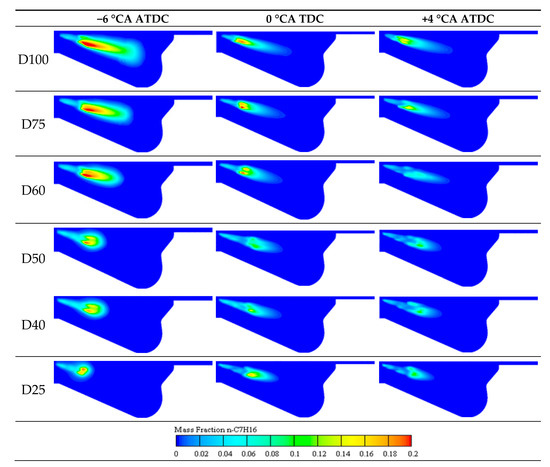 Figure 7 and Figure 8 show the in-cylinder temperature distribution and diesel distribution at different NG mixing ratios. It can be seen that the diesel injection time in the pure diesel case is earlier than that of the dual fuel, and a better-atomized fuel is formed at −6 °CA ATDC. As the NG fraction in dual-fuel increases, the lag time of diesel injection increases. Thus, the fuel atomization time was also delayed correspondingly. It can be seen that the premixed combustion in the cylinder is over, and the diffusion combustion phase has been entered at the time of TDC when the diesel fraction is high. Similarly, the start of premixed combustion is relatively late in dual fuel with a high NG fraction. In addition, it can be found that it is basically at the stage where the average temperature of combustion in the cylinder is the highest at the 15.7 °CA ATDC. With the increase of NG mixing proportion in dual fuel, the high-temperature area in the cylinder distributes more widely, resulting in a higher average temperature in the cylinder.