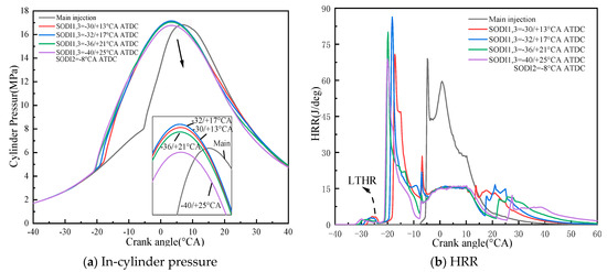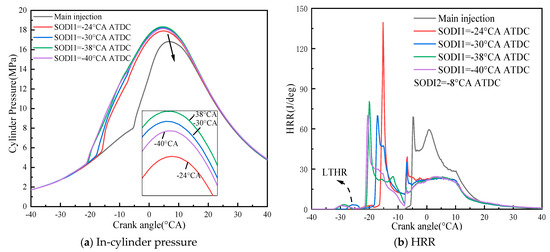 Figure 9 shows the cylinder pressure and HRR in the cylinder with a single main injection and pilot-main injections at different SODI1. When the SODI1 at −30 °CA ATDC, the peak pressure increases from 16.8 MPa to 18.6 MPa compared with the single main injection. There is an increase of about 10.7% (See Figure 9a). However, when SODI1 further advances from −30 °CA ATDC to −38 °CA ATDC and −40 °CA ATDC, the peak pressure in cylinder decreases and the ignition delay angle is further reduced. Based on the analysis of the HRR, it is obvious that compared with a single main injection, the pilot-main injection strategy improves the combustion and increases the peak pressure in the cylinder (See Figure 9b). With the advancement of the SODI1, the cylinder pressure and the peak HRR both show a trend of first increase and then decrease. It is due to the fact that the in-cylinder mixture is mixed more fully with the advance of the SODI1, increasing the chemical sensitivity of the fuel. Therefore, the heat release advance and accompany by low temperature heat release (LTHR), the combustion delay angle of the diffusion combustion phase is reduced, as the SODI1 continuously advance, the combustion delay angle further decreases, keeps the main combustion close to the TDC.