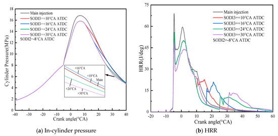Figure 10 shows the cylinder pressure and HRR with single main injection and main-post injection strategy at different SODI3. It can be seen that compared with single main injection, the peak pressure in the cylinder and the peak HRR are reduced. With the delay of the SODI3, there is no effect on the peak cylinder pressure in the diffusion combustion stage, but the peak HRR decreases, the post-injection diesel slightly increases the heat release in the later combustion stage. With the SODI3 from +10 °CA ATDC delay to +30 °CA ATDC, the peak pressure in cylinder changes little, because SODI3 has no effect on the combustion start stage (i.e., premixed combustion process), but the peak HRR is significantly lower. It is due to the fact that only 75% of the original fuel injection in the main injection phase and 25% of diesel in post injection is injected to cylinder, not conducive to the premixed combustion and diffusion combustion.