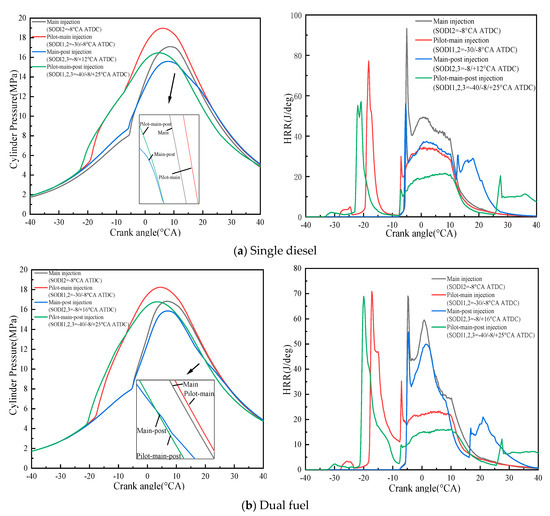 - Compared with the single main injection, the main-post injection strategy can reduce the cylinder pressure and HRR. However, the cylinder temperature is reduced in the main injection stage. The NOx and CO emissions is reduced. When the SODI3 is 24 °CA ATDC, the NOx emission is reduced by 29.6%.