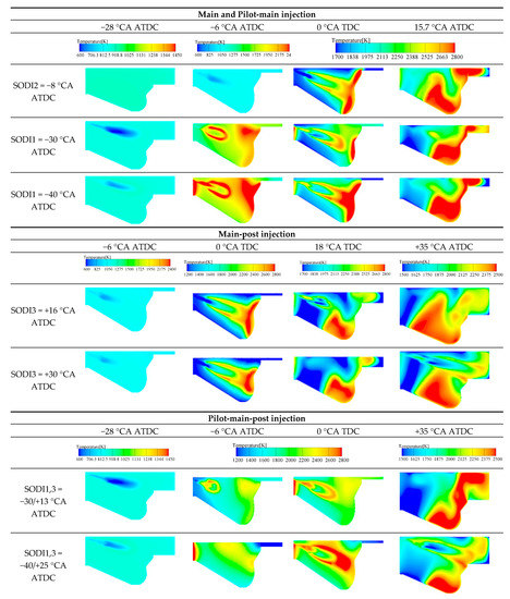 Figure 14c shows the NOx emission with the main-post injection strategy. It can be seen that the main-post injection strategy can reduce NOx emission compared with main injection strategy. With the increase of SODI3, the NOx emission firstly decreases and then increases. Compared with main injection, the NOx emission of main-post injection strategy increases by 29.6%when the advance angle is +24 °CA ATDC. In addition, NOx emission decreases by 7.6% when the SODI3 delay is from +24 °CA ATDC to +30 °CA ATDC. It is due to the fact that only 75% of the original fuel injection in the main injection phase and 25% of diesel in post-injection phase is injected to cylinder. Thus, it significantly reduces the temperature in the cylinder during the main fuel injection phase, thereby inhibiting the generation of NOx.