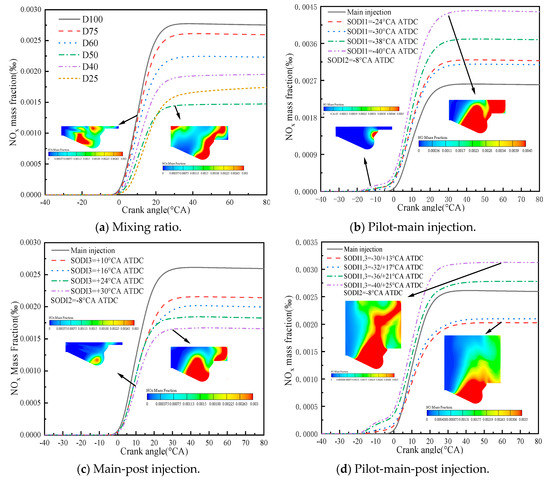 Figure 14 shows the NOx emissions with different NG mixing ratios and different diesel injection strategies. It can be seen that the NOx formation increases rapidly between 0 and 30 °CA ATDC. Compared with the pure diesel case, the combustion of dual fuel can significantly reduce NOx emission. Moreover, NOx emission firstly decreases and then increases with the increase of the mixing ratio of NG. For example, compared with pure diesel case, NOx emission of D50 is reduced by 47%. In addition, when the proportion of NG in dual-fuel increases from 50% to 60%, NOx emission increase by 24%. It is due to the high temperature caused by the improved combustion. With the increase of the NG mixing ratio, the mixture fuel in the cylinder is fully mixed and the combustion process a is more complete and rapid.