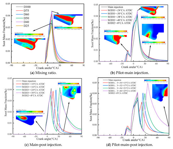 The multiple injection technology not only improves the combustion process, but also reduces the pollutant emissions, and optimizes the trade-off relationship between soot and NOx [32]. Figure 15 shows the soot emission with different NG mixing ratios and different fuel injection strategies. It can be found that the soot mass fraction in the cylinder firstly increases and then decreases with the increase of NG mixing ratio. The soot emission reaches the highest and lowest when the ratio of NG is 60% and 75%, respectively. The soot emission is mainly distributed in the high temperature and oxygen-poor area, and then gradually reduced by oxidation. With the addition of pilot injection and post injection, the emission of soot changes from a single peak of the main injection to a double peak. When there is no pilot injection, soot emission is mainly distributed in the front of the combustion chamber. However, in the pilot injection and post injection stage, soot is mainly generated at the bottom and rear of the combustion chamber. The use of pilot-main injection will slightly increase the emission of soot. It is due to the fact that the amount of fuel injected in the pilot injection stage is less, and the local high temperature generated by combustion and the oxygen-deficient environment in the middle of the fuel beam create conditions for soot generation. When the pilot-main-post injection strategy was adopted, the emission curve of soot shows three peaks, and the three peaks show a trend of first decreases and then increases with the advance of the SODI1 and the delay of the SODI3. From the changing trend, it can be seen that the SODI3 has a greater impact on this strategy.