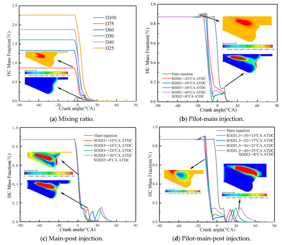 Figure 16 shows the HC emission and methane distribution with different NG mixing ratios and injection strategies. Figure 16a shows that the HC emission firstly increases in the initial stage and then decreases with the increase of NG mixing ratio. Compared with pure diesel, the NG mixing generated more HC in the early stage. However, a large amount of HC was oxidized at −8 °CA ATDC. As seen in Figure 16b, the NG combustion can be clearly promoted by using the pilot-main injection strategy. Some previous studies have found that the main source of HC emission is the incomplete combustion of dual fuel. The combustion phase was also advanced with the increase of SODI1. Thus, more HC will be oxidized. As seen in Figure 16c, it can be seen that the NG combustion rate decreases with the main-post injection strategy. As the post injection diesel enters the cylinder, the HC emission will appear a second small peak at the back. It is due to the fact that the reduction in injection mass leads to the decrease of in cylinder temperature in the main combustion stage and the increase of incompletely burned NG. Figure 16d shows that the pilot-main-post injection strategy improves the combustion and accelerates the combustion rate of NG, but the post injection diesel also forms a second HC emission peak. In addition, Figure 17 shows the combustion rate of CH4 under different injection strategies. It can be seen that the pilot-main injection and pilot-main-post injection strategies can advance the combustion of CH4 and make it burn more fully at TDC. On the contrary, the main-post injection is not conducive to the combustion of CH4 in cylinder.