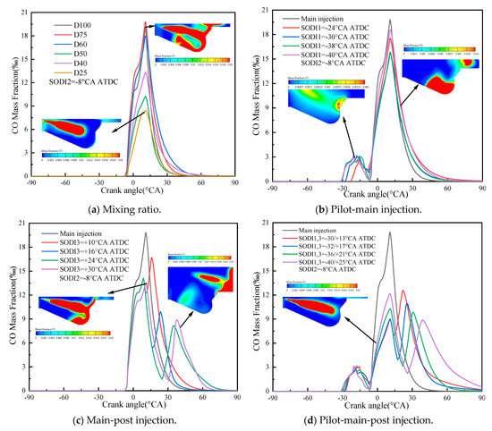 CO is a kind of intermediate product, which is mainly caused by the incomplete combustion due to the low temperature and lack of oxygen in some areas during in-cylinder combustion. Figure 18 shows the CO emission under different NG mixing ratios and injection strategies. It can be seen that the CO emission is significantly reduced with the increase of NG mixing ratio in the early stage. It is due to the fact that the higher concentration of NG is helpful to combustion, the higher temperature in the cylinder, and the more abundant positive gas are conducive to the conversion of CO into CO2. Figure 18b–d show that the pilot-main injection, main-post injection, and pilot-main-post injection strategies of can further reduce the CO emission in the early stage. It is due to the improved combustion caused by the NG in dual fuel. At TDC, CO mainly distributed in the outer region of diesel injection trajectory, where the fuel concentration was high and the oxygen was poor. In addition, when the injection advance angle decreases, the CO emission increases. It is due to the fact that the fuel injected later does not have enough time to oxidize.