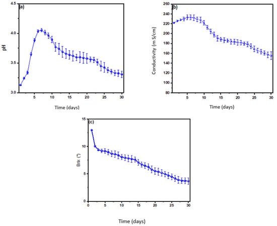 In Figure 3a, the pH values monitored for 30 days are observed. An increase in pH from 3.12 (moderately acidic) to 4.05 ± 0.092 (slightly acidic) from the first to the seventh day is seen, followed by a decrease until the last day (3.30 ± 0.27), showing acidic pH throughout the monitoring. According to León et al. (2021), in pH with acidic levels, energy generation increases because it contributes to a higher potential of concentration of microorganisms for substrate oxidation [27,28]. Likewise, due to high concentrations of fermentable carbohydrates in cells, pH can drop rapidly due to the formation of acidic products by fermentative metabolism. On the other hand, even if low pH values cause a reduction in energy production, this energy may be recovered if the pH is re-adjusted for the ideal conditions of energy-generating microorganisms [29,30]. In Figure 3b, the conductivity values monitored during the 30 days of operation are observed. These values increased from the first day (221.72 mS/cm) until their maximum peak on the fifth day (233. 94 ± 0.345 mS/cm), in which afterward, they descended steadily until the last day (154.34 ± 10.68 mS/cm). In Figure 3c, the values of degrees Brix are shown. As it can be seen, the values decrease from the first day (12.94 ± 0.03) until the last day (3.62 ± 0.78) of monitoring. It is worth mentioning that blueberry is rich in water and sugars such as sucrose, glucose, rhamnose, galactose and a relatively high number of organic acids such as citric and ascorbic acid, different than sugar [31] so that yeasts consume these sugars to get energy for their growth [32].