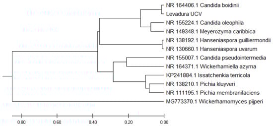 For molecular identification of yeast, specific DNA regions helping this end are necessary. These are ITS regions, which are specific to identify fungi [40]. The regions sequenced and analyzed with the BLAST program resulted in a match identity percentage of 99.86% (Table 1), which corresponds to the Candida boidiinii species. This species of methylotrophic yeast belongs to the Saccharomycetes class [41,42] and has the capacity to use pectin as a carbon source [43], a component present in plant cell walls of fruit and vegetables [44].