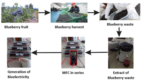 Likewise, blueberries have exponentially increased their production during the last five years around the world; for example, in Europe and America, in 2019, 136,495 and 676,313 tons of blueberries were commercially produced, respectively [7]. The increase in its consumption is mainly due to its valuable components (K, Ca, Mg, P, Fe, Mn and Zn), which are essential for the human diet [8]. In this sense, the import and export of this product throughout the world has increased, as well as the increase in waste of this fruit. Particularly in Peru, blueberry production in 2018 reached 89,735 tons, which represented a greater volume of 71.6% compared to 2017. The departments of La Libertad, with 16.8 t/ha, Lambayeque (15 t/ha), Ica (8.2 t/ha), Lima (4.5 t/ha) and Ancash (4.1 t/ha), stand out in terms of the highest yield rates [9]. Because of this, the waste of this type of fruit has generated the need to give an added value and produce benefits to the owners of this material. In this sense, organic waste has been used as a fuel in MFC, which is being intensively studied due to the use that can be given to these types of materials for generating electric current [10]. Toding et al. (2018), in their research, used banana and orange peel as fuel (substrate) for the generation of electricity in its single-chamber MFC with copper and zinc electrodes (anode and cathode) coated with activated carbon and graphite, respectively; generating approximately 0.67 V in the orange-peeled cell [11]. Manjrekar et al. (2018) manufactured low-cost, double-chamber MFC by using aluminum electrodes and kitchen waste (orange peels, banana peels, vegetable peels, vegetable scraps, etc.) as fuel, generating a voltage of 1.57 V by connecting the four cells produced in series [12]. Kondaveeti et al. (2019) studied power generation in a single-chamber microbial fuel cell from the citrus peel as substrate. Voltage results showed a generation of 262 mV, a current density of 349 mA/m2, with a maximum power generation of 71.1 mW/m2 with an organic load of 3 kg/m3 [13]. In addition, Kamau et al. (2018) studied voltage generation in MFC from the use of food waste, where the results showed that the average voltage obtained was higher in avocado waste at 0.357 V and lower in watermelon waste at 0.009 V. Power and current density for all fruits were in the range from 0.060 to 22.530 µW/m2 and 0.751 to 63.110 mA/m2, respectively [14]. Finally, Din et al. (2020) used potato waste in single-chamber MFC with copper and zinc electrodes, generating a voltage and peak current of 1.12 V and 12.5 mA in a single cell, demonstrating high efficiency for a pH of 7.2 and external resistors of 90 Ω [15]. It is important to mention that a large part of these fruits or vegetables are destined for the industry, so it generates residues that can be used, giving them an added value and minimizing the impact of their accumulation on the environment [16], by turning microbial fuel cells into sustainable technology to generate bioelectricity from organic waste [17].
