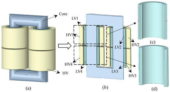 In recent years, the split-winding transformer winding transformer has been widely used [1,2], playing an important role in the fields of rail transit, industrial, etc. The split-winding transformer has high short-circuited impedance, which can limit the starting current of the motor and short-circuit current. It is often used in frequent short-circuit situations. However, the frequent current impact may induce the turn insulation aging and damage. In addition, the winding structure and manufacturing process of the split-winding transformer are more complex, which results in the higher probability of a turn-to-turn fault (TTF) of the split-winding transformer compared with the ordinary transformer. Therefore, the short-circuit problem of split-winding transformers needs special attention. When the TTF occurs, there are increased magnetic flux leakage, core saturation and winding overcurrent in the transformer [3,4], causing a critical mechanical stress, and resulting in deformation of the winding shape [5,6,7]. Additionally, the strong local magnetic field generated by the TTF current distorts the magnetic field in the core and space, which affects the normal operation of the other windings through magnetic coupling relations [8,9]. Therefore, split-winding transformers require special short-circuit designs to take these factors into account, while obtaining these influence laws is also an important prerequisite for the design of split-winding transformers.