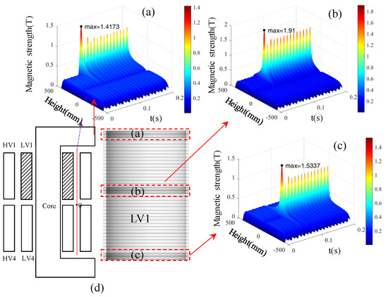 Nonlinear ferromagnetic materials and branch windings can affect the magnetic field distribution, so the influence of TTFs at different spatial positions is different. In order to comprehensively evaluate the impact of TTFs, the bottom, the middle and the top of two-turns TTF in LV1 low-voltage winding are analyzed. The positions of TTFs and the distribution of magnetic flux leakage between HV1 and LV1 under the TTFs are shown in the Figure 3.