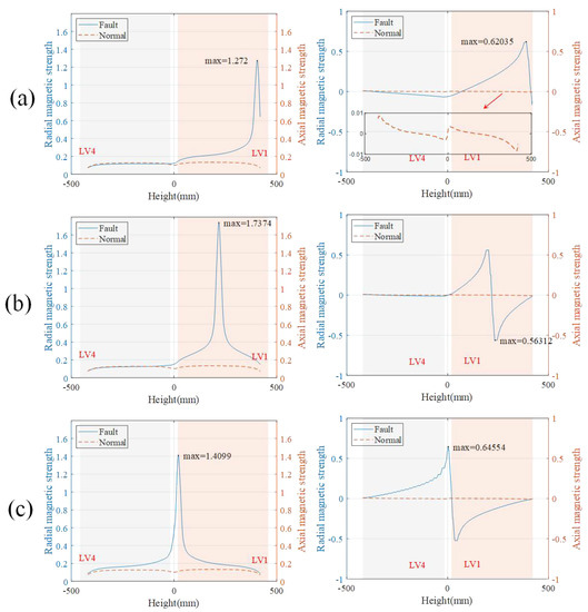 The distribution of radial and axial magnetic flux leakage under the TTFs at 59 ms. (a) Top turn-to-turn fault. (b) Middle turn-to-turn fault. (c) Bottom turn-to-turn fault.