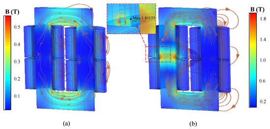 The magnetic leakage field generated by short-circuit fault makes the core local magnetic saturation, which results in core vibration and local heating. The normal magnetic field and the fault magnetic field of bottom TTF under the maximum of peak short-circuit current are shown in Figure 5.