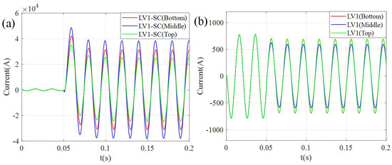 The currents of LV1 sort-circuit winding and LV1 winding under three cases of TTFs. (a) The current of LV1 sort-circuit winding (LV1-SC). (b) The current of LV1 winding.