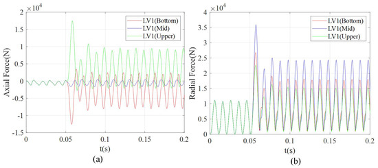 The radial resultant force and axial resultant force of LV1 under the TTFs at different positions. (a) The axial resultant force. (b) The radial resultant force.