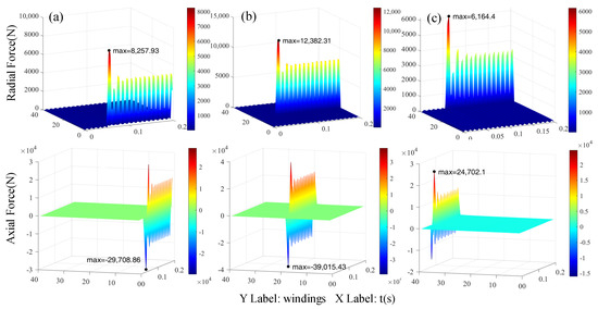 The radial force and axial force of per-turn wire of LV1 outermost winding under three cases of TTFs are shown in Figure 9, with 39 turns of wires in this layer. When the middle part of LV1 is short-circuit, the peak radial force and peak axial force of the short-circuit winding are 12.4 kN and 39 kN, respectively. When the bottom part of LV1 is short-circuit, the peak radial force and axial force of single turn winding are 8.2 kN and 29 kN, respectively. When the top part of LV1 is short-circuit, the peak radial force and axial force of the single turn winding are the smallest, which are 6.2 kN and 24.7 kN, respectively. However, there is a large difference between the reverse force and the forward force in the axial force of the winding, and the difference between the maximum peak force is 4.3 kN.