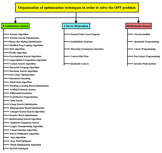 Table 2 provides a classification from the optimization algorithm stance in which all of the OPF studies are categorized according to implemented solvers (i.e., optimization algorithms). From this table, it is inferable that the hybrid optimization algorithms are trending, which can be due to the following reasons: (1) they can be simply implemented to solve a variety of optimization problems, (2) they have a combination of the strong points associated with at least two separate optimization algorithms, and (3) they can significantly reduce the computational complexity of the OPF problem. However, the aforementioned advantages are highly dependent on the hybridizing approaches based on which more than one optimization algorithms are combined. As a case in point, three different algorithms were first modified via a self-adaptive mutation operator and then hybridized in a parallel fashion to solve a transmission expansion planning problem integrated with wind farms [