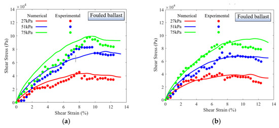 In general, it can be concluded that the developed model performed reasonably well in capturing the overall shear stress–strain behavior of fresh ballast assembly under the investigated range of normal stresses. It is worth noting that, for typical 20 to 30-ton axle loads, the confining pressure within the ballast layer is usually in the range of 10–40 kPa and rarely exceeds 60 kPa [33].