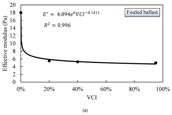 The relationship between VCI and effective modulus is approximated using a power fit described by Equation (11). The effective modulus rapidly decreased from 18 Pa to about 5.5 Pa with the increase in VCI from 0% (fresh ballast) to about 20%. Little change in effective modulus was found for VCI of more than 20%.