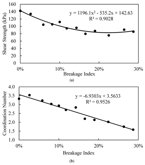 The shear strength results corresponding to different ballast degradation levels are plotted in Figure 14a, along with the best fit line. The shear strength is found to gradually decrease from 140 kPa to about 80 kPa as the breakage index increased from 0% to 20%. No significant change in shear strength occurs as a result of further increase in the breakage index. Figure 14b shows the change in co-ordination number with the increase in the breakage index. The co-ordination number was found to decrease to about half of its value when the breakage index reached 30%. Similarly, the porosity of the ballast assembly (seen in Figure 14c) was found to decrease from about 0.39 to about 0.29 as the breakage index increased from 0% to about 30%.