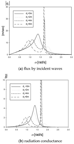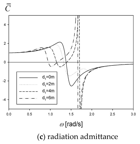 Figure 3a shows the flux at the internal surface by the incident wave as a function of the barrier height () and wave frequency. The chamber length (a) and submerged depth () are 3 m equally, the barrier distance (b) 1.5 m, and the water depth (h) 10 m. Two resonance peaks are shown within the entire wave frequency range (). The first resonance, which seems a little wider and belongs to the lower-frequency region, occurs in the chamber region (3). It is called the piston-mode resonance, where the water surface goes up and down in unison at resonance, being different from the sloshing-mode resonance. The second spike-like peak attributes to the piston-mode resonance in the fluid region (2) existing between the vertical barrier and chamber wall. In particular, the second resonance is more conspicuous in the enclosed fluid region, which can be made by increasing the barrier height, and disappears when , as expected. As the barrier height increases, the first resonance frequency decreases to 1.34, 1.26, 1.10, and 0.94 rad/s, and its peak value and width are also reduced. In Figure 3b,c, the flux by the oscillating air pressure is investigated under the same conditions as in Figure 3a. The non-dimensional radiation admittance () increases with the wave frequency and changes abruptly from a positive to a negative value at the particular frequencies which coincide with the piston-mode resonance frequencies of each region. On the other hand, the non-dimensional radiation conductance () has a maximum value at the same frequencies. This unique phenomenon occurs when a fluid region inducing resonance is present inside the oscillating system. As the barrier height increases, both the peak value and peak frequency at the first resonance decrease.