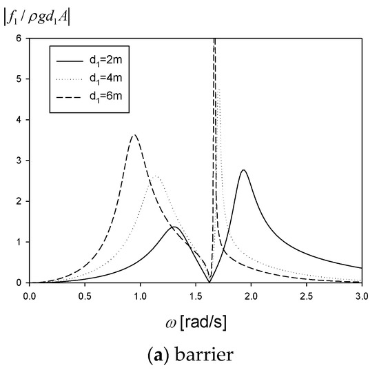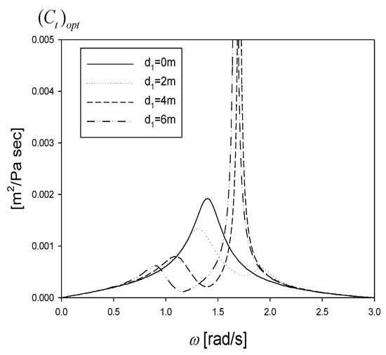Figure 5 plots the optimum turbine constant () given in Equation (29) according to the barrier height. The optimum turbine constant is a kind of PTO (Power Take-off) damping constant that inevitably appears when converting wave energy into mechanical energy. As seen in Figure 5, the optimum turbine constant is a function of wave frequency and has a maximum value at each resonance frequency. Based on this, we can select the optimum turbine constant responding to the frequency of the incoming waves.
