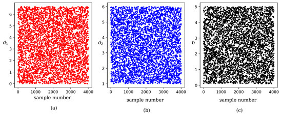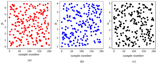 Using the LHS, we can fill the sample space within its bounds by maximizing the stratification of each edge distribution, which improves uniformity. A sample set containing 200 samples was established and scatter diagrams of the samples are displayed in Figure 9. Each input feature fills the whole sample space and the standard deviation seems to be small as shown in Figure 9.
