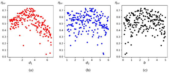 A feature study is conducted on the database to obtain the correlation between the input and output features. Figure 10 and Figure 11 show the scatter plots of the conversion efficiency () and non-dimensional significant wave force () on the barrier at fixed energy period in irregular waves. Variation of each output feature versus three input features is displayed in the separate figure. There exists a significant correlation between the conversion efficiency and barrier height as shown in Figure 10a and the correlation coefficient is 0.467 at . The correlation between the conversion efficiency and other input features (,b) is observed to be less significant when compared to .