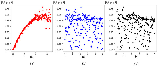 Variation of non-dimensional significant wave force () on the barrier as a function of the input features is shown in Figure 11. It is observed that a strong correlation occurs between the wave force and barrier height (). The correlation coefficient is 0.884. The wave forces increase steadily with the barrier height as expected. As in the previous figure, the correlation of with other input features (d2,b) is insignificant.