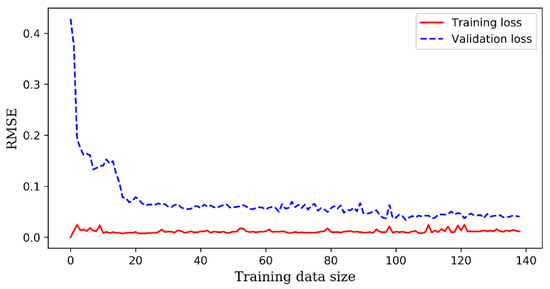 An ANN model is trained with the training data and validated with the test data. Figure 14 shows the learning rate curves of an ANN model at which indicates the performance of the model on the training and validation as a function of the size of the training data. The value of the loss function (root mean squared error) is initially zero and starts to go up as the size of the training data increases. However, it will finally reach a low plateau, where adding new data points to the training dataset does not make the averaged error better or worse. Likewise, the ANN model is not capable of being generalized properly at the initial stage, that is the reason why the validation error is quite large.