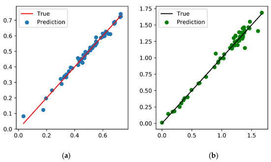 Comparison of the predicted and true values for (a) conversion efficiency and (b) non-dimensional significant wave force on the barrier at in irregular waves.